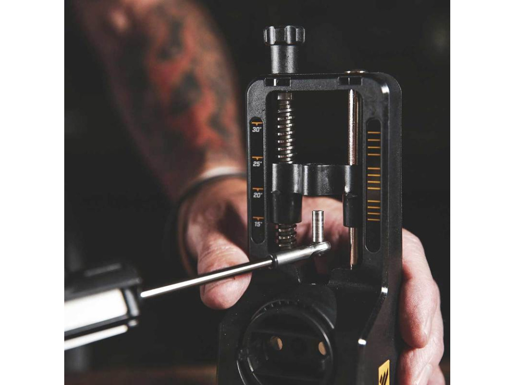 Brúsny systém Work Sharp Precision Adjust možno nastaviť do ľubovoľného uhla od 15 do 30 stupňov. Na rozdiel od bežných systémov, ktoré majú niekoľko otvorov na zvolenie požadovaného uhla, má Precision Adjust nastavovaciu skrutku na nastavenie vášho, zvoleného uhla. Ak chcete pridať ďalší stupeň alebo dva, jednoducho otočíte nastavovacou skrutkou.