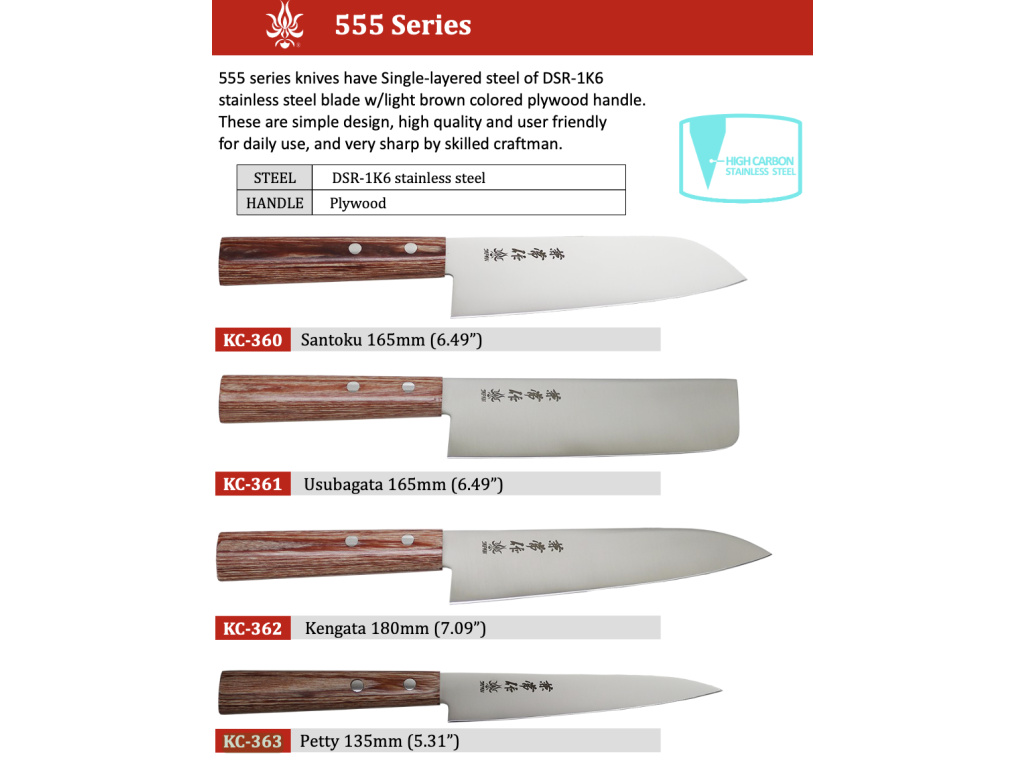 555 series knives have Single-layered steel of DSR-1K6 stainless steel blade w/light brown colored plywood handle. These are simple design, high quality and user friendly