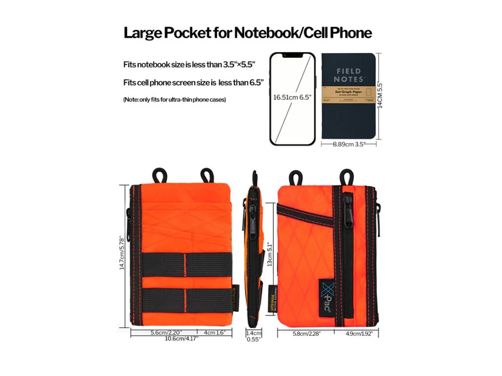 The tool bag is designed with 2 Zippered pocket are ideal pocket organizers for holding coins, ID cards, credit cards,compass, small notebooks and other small EDC items or daily essentials, a cellphone pocket for holding your phone (size ≤ 6.5'') or small notebook. 3 tools slots for your multitools/pocket knife/flashlight/tactical pen, which can greatly save space and keep things firm and not easy to fall off.