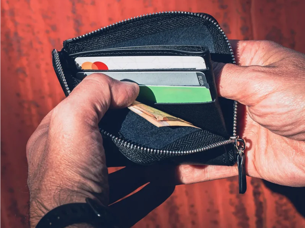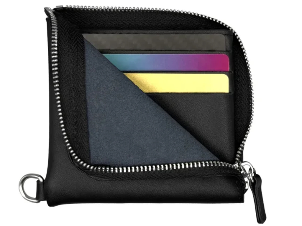 Mestská čierna kožená peňaženka s obojstranným zipsovým zapínaním a malým háčikom na pripevnenie šnúrky na opasok, čím sa zabráni náhodnej strate alebo nechcenému vybratiu.