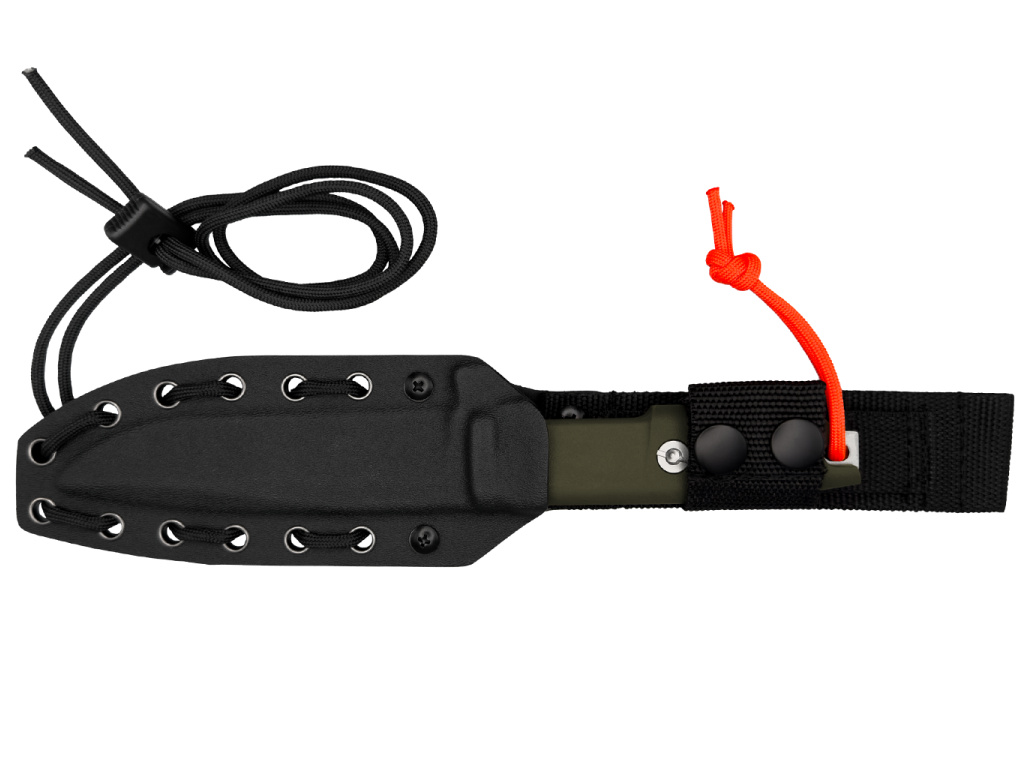 Vysoko viditeľná oranžová paracordová šnúra je bezpečnostným prvkom: keď nôž spadne, keď ho terén skryje, je nevyhnutné ho znova nájsť.