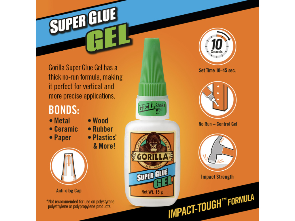 Vhodné pre drevo, kovy, keramiku, plasty, gumu a mnoho ďalších materiálov – Gorilla Super Glue Gel 15g je spoľahlivý pomocník pri každej precíznej oprave.