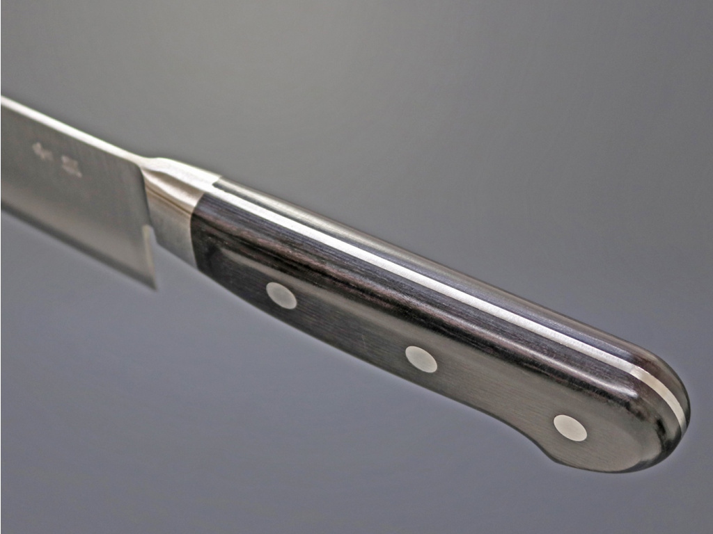 Klasická westernová rukoväť z čiernej preglejky je s čepeľou spojená 3 nitmi, ktoré zaisťujú dokonalú pevnosť a poskytujú najlepšiu kontrolu pri rezaní a krájaní.