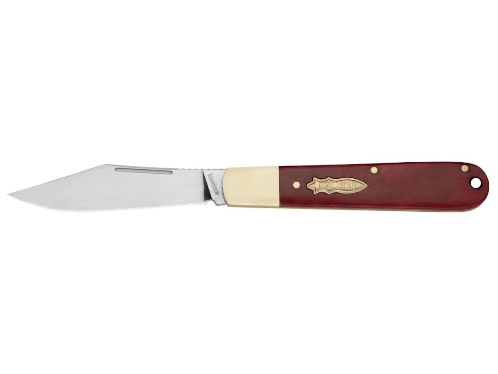- Hladká kostená rukoväť s červeným vzorom a niklovou ochrannou vložkou; klasický vreckový nôž s klipsovým hrotom