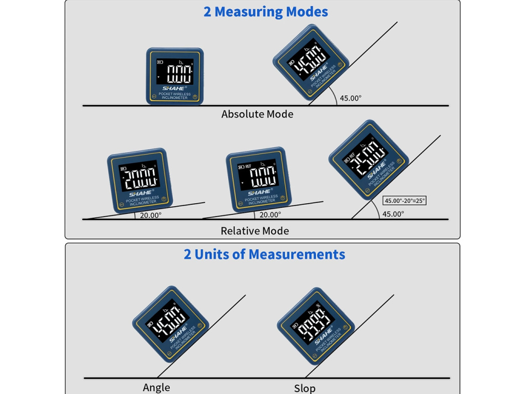 - Funkčnosť: Dva režimy merania (absolútny a relatívny uhol), fixácia aktuálnej hodnoty, automatické vypnutie, vstavané magnety pre upevnenie na kovových povrchoch.