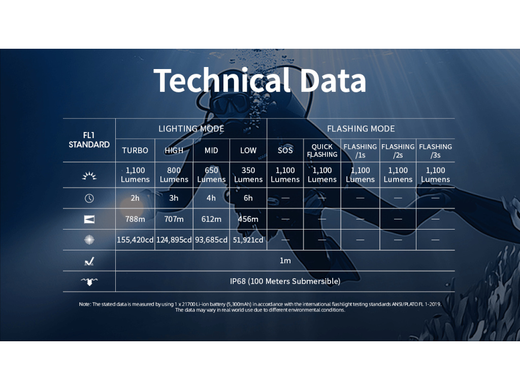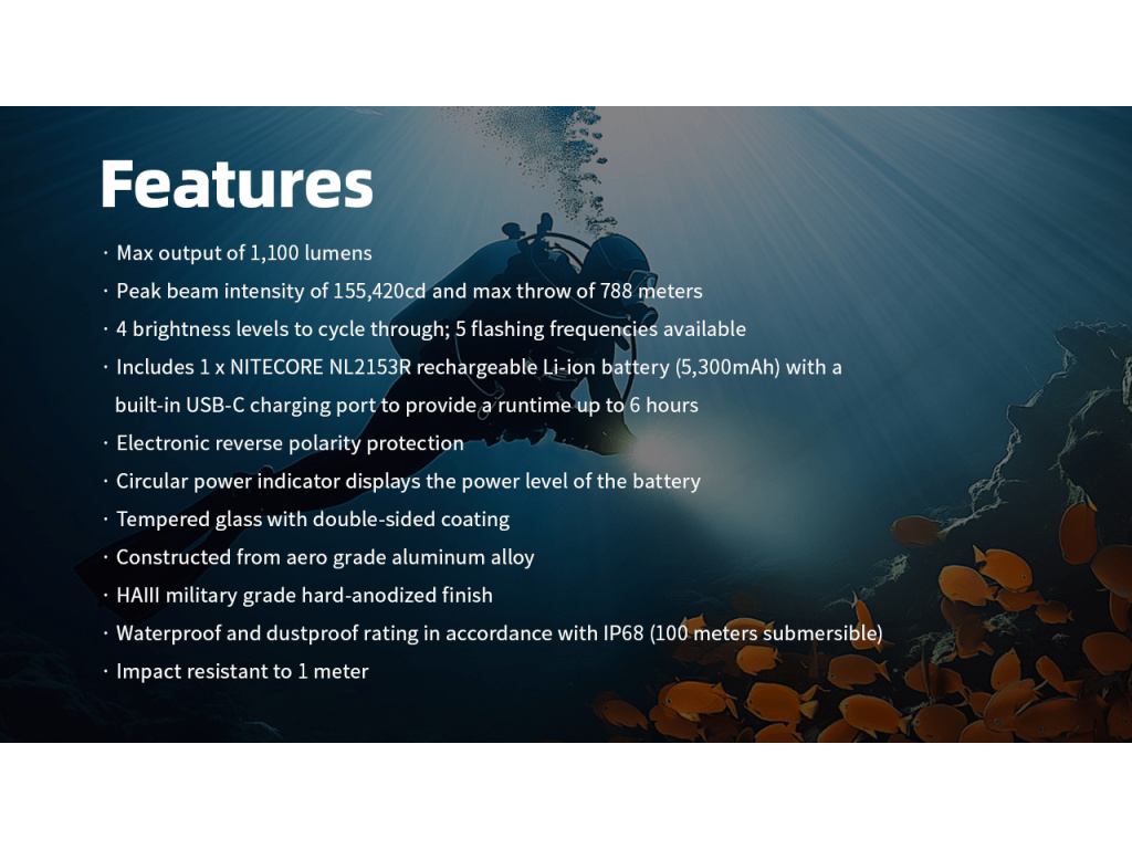 - Maximálny výkon 1100 lúmenov poskytuje jasnú a čistú viditeľnosť pod vodou.