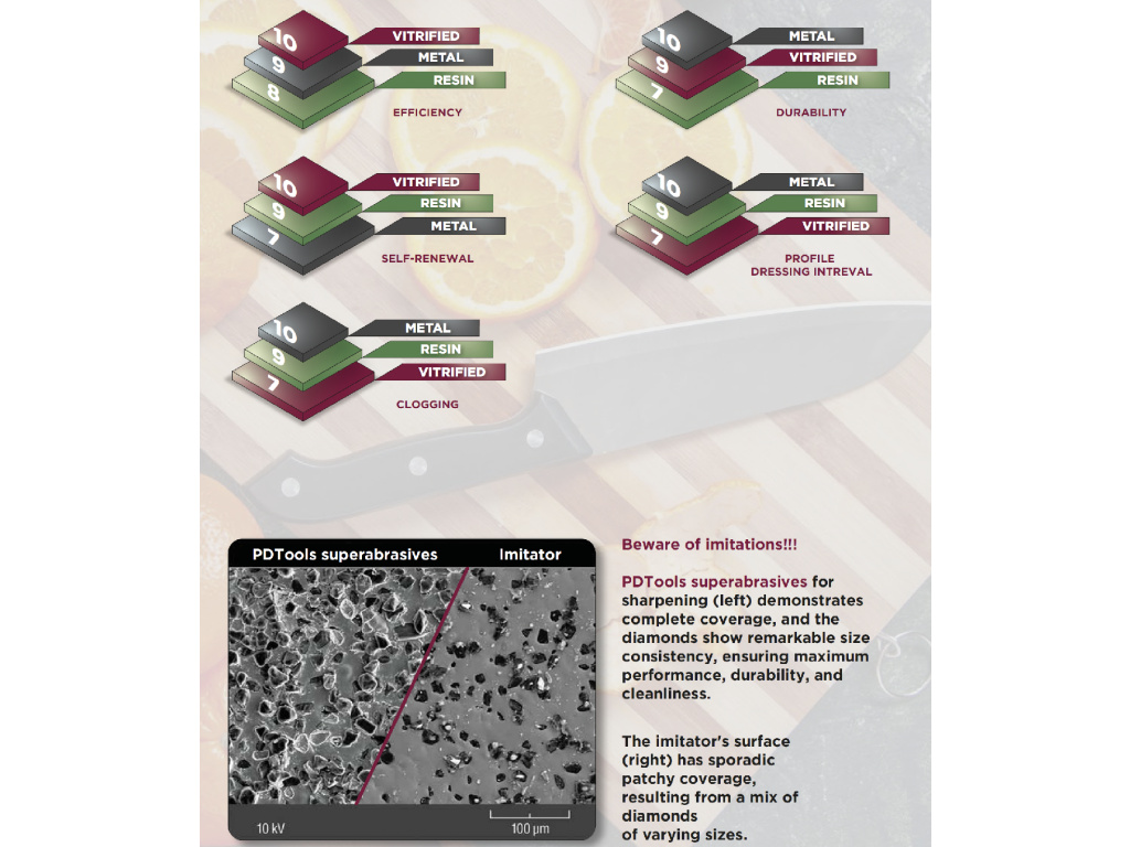 - Pohodlie pri práci — kameň je dostatočne tvrdý, ale pohodlný pri práci. Často sa porovnáva s japonskými vodnými kameňmi, ale CBN je oveľa odolnejší ako oni.