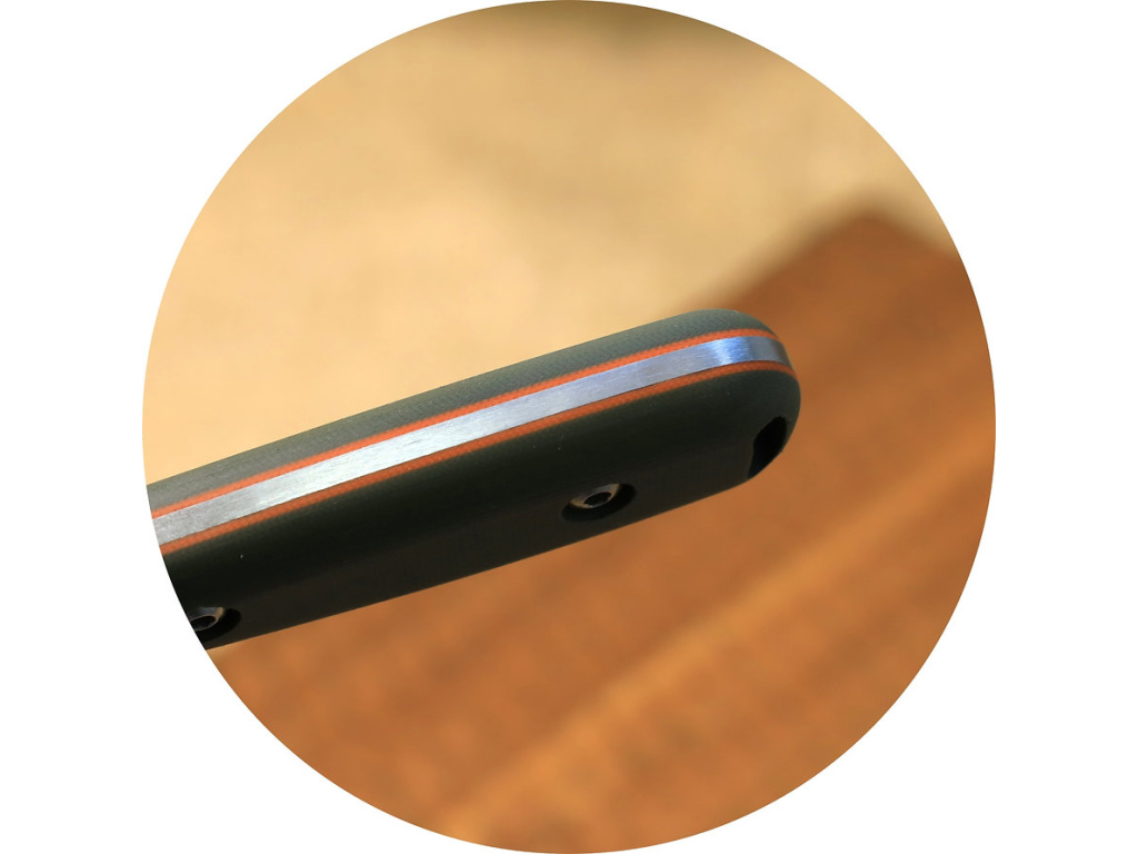Rukoväť z G10 poskytuje bezpečný úchop v rôznych polohách, čím zaisťuje pohodlie a kontrolu pri dlhodobom používaní, zatiaľ čo oranžové vložky dodávajú vítaný farebný akcent.