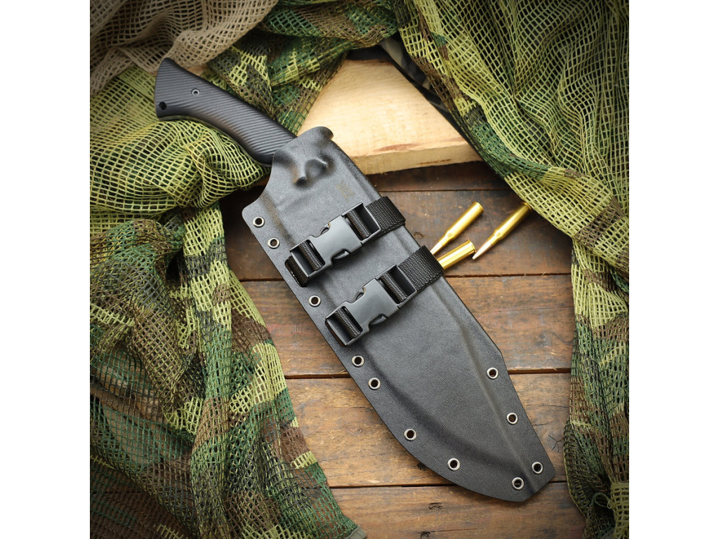 Nosenie je zabezpečené ručne vyrobeným puzdrom v štýle TACO z kydexu, ktoré je vylepšené o praktické funkcie. Predĺžené otvory umožňujú pripevniť popruhy presne podľa vašich predstáv, vrátane priamej kompatibility so systémami MOLLE. Je modulárne, pevné a pripravené na integráciu do Vašej výbavy, namiesto toho, aby s ňou bojoval.