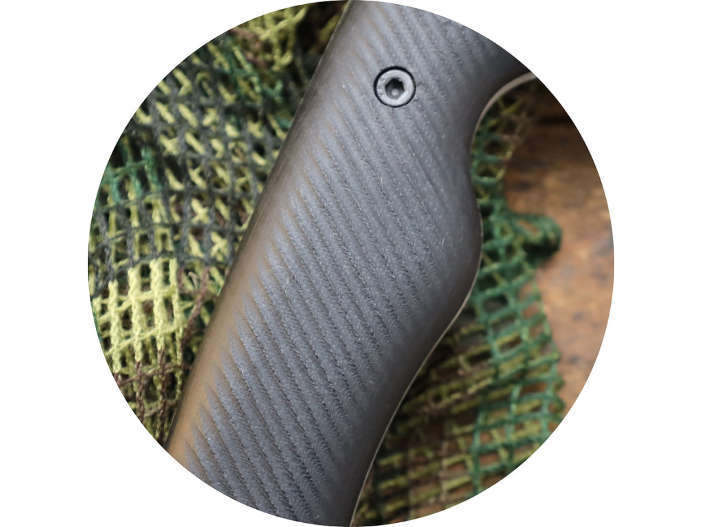 Textúrovaná rukoväť z G10 je nastavená na skutočné použitie – nôž bezpečný v holých rukách, spoľahlivý v rukaviciach a spoľahlivý, keď podmienky nie sú ideálne. Žiadne horúce miesta, žiadne šmýkanie, len kontrola.