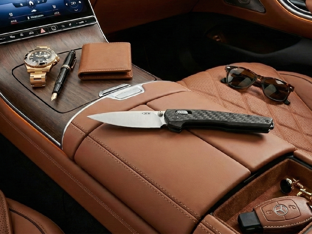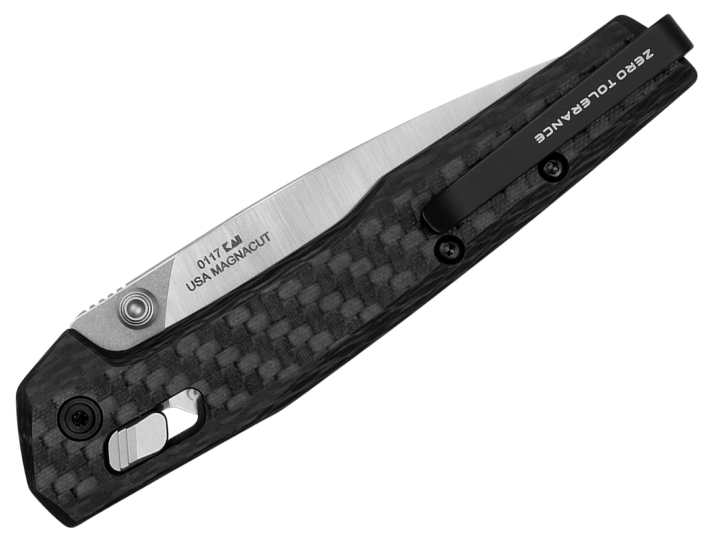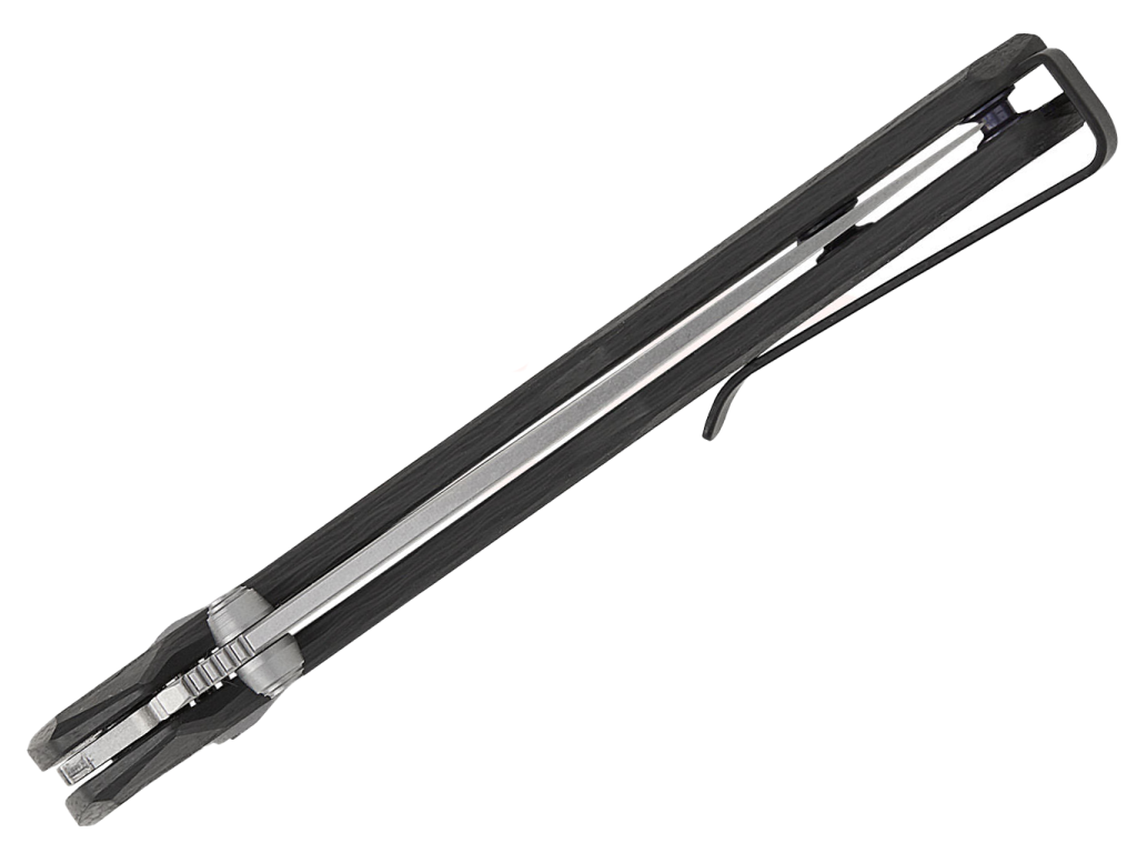 Ľahká rukoväť z uhlíkových vlákien sa spája s dvojfarebnou čepeľou MagnaCut so saténovou a kamennou povrchovou úpravou, ktorá vyvažuje lesk a drsnosť. Vlastný kolík na palec a precízne opracovaný mechanizmus DuraLock zaisťujú plynulé a spoľahlivé ovládanie, zatiaľ čo titánové rúrkové rozpery a čiastočne vsadené vložky udržiavajú konštrukciu pevnú, no zároveň ľahkú.